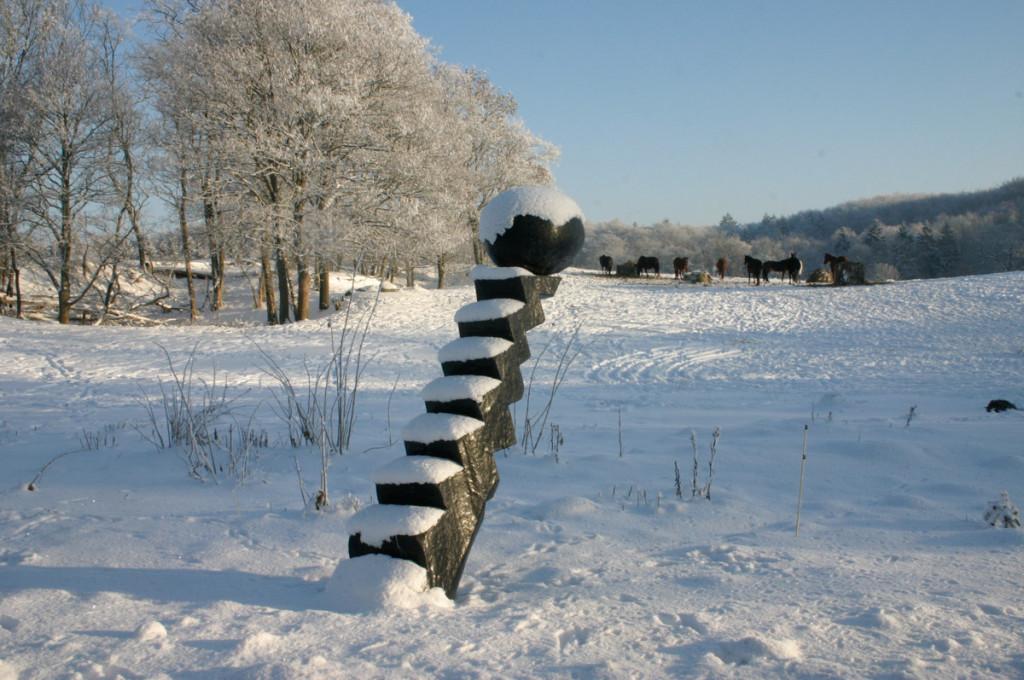 Treppe?Treppe? PyramideAus Paletten, mit goldener Spitze Das Urteil des ParisEin Ensemble SpionAgent aus der Unterwelt Roter StuhlFür Große Figuren am AhornBaum und Mensch Treppe mit EiOben liegt das Leben Wolfsfrau auf FindlingGroße Findlinge, starke Frauen AhnensteineKöpfe in Stein Ohne TitelSchwerter in Stein FloßAuf dem Weiher in Görzhausen SteleAm Dorfplatz